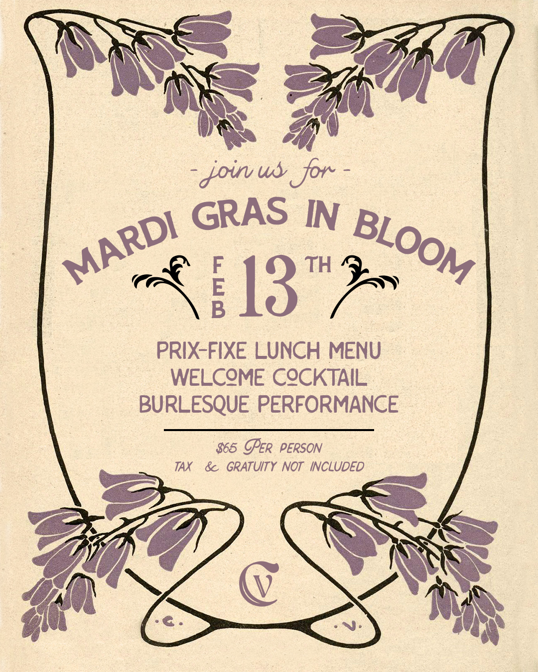 Mardi Gras in Bloom is Copper Vine’s Deep Gras lunch. It is a seated, table-forward experience designed to share. Guests are welcomed with a mimosa and passed appetizers before settling in for a festive three-course lunch and an exciting burlesque performance.