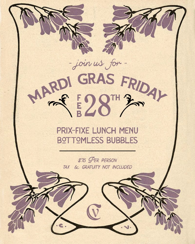Join us Friday, February 28th for a bottomless three-course lunch at Copper Vine. Perfect for float lunches, parade goers, and everyone in between.