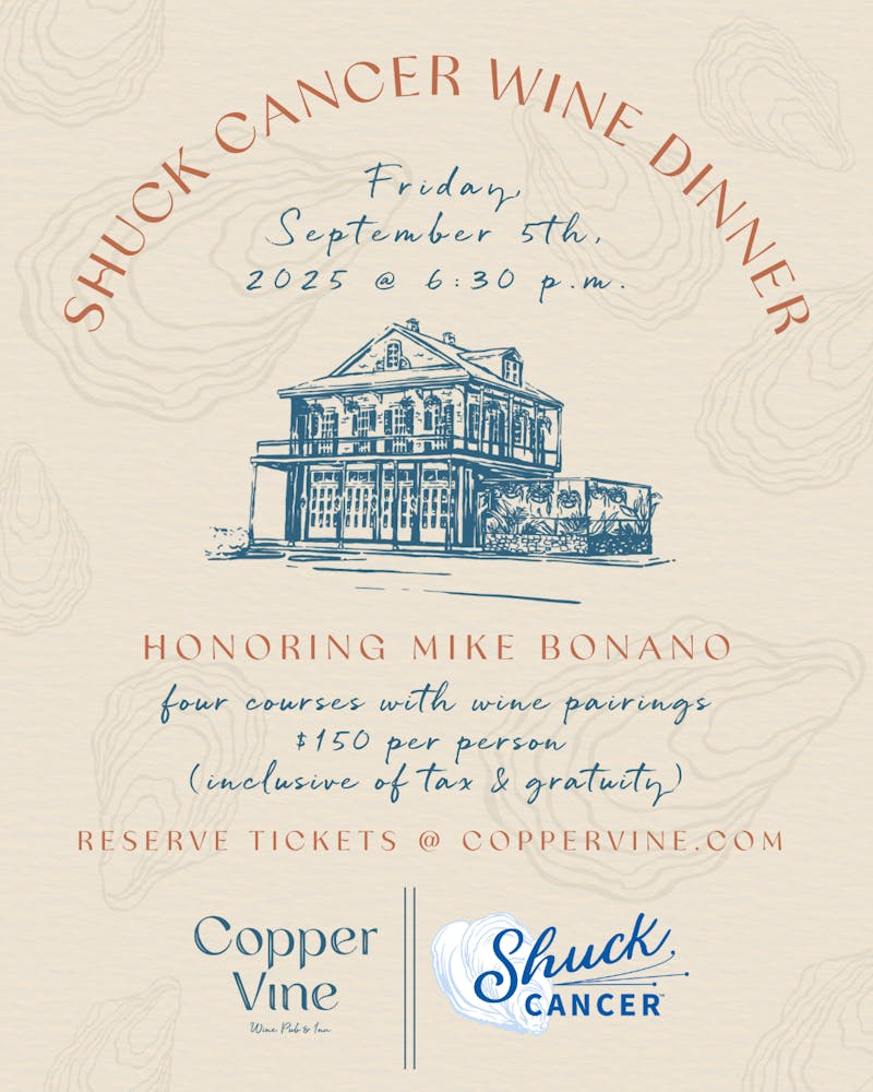 Join us at Copper Vine for an intimate evening where fine wine, exceptional cuisine, and community spirit come together to raise funds for the fight against cancer. All proceeds from this dinner will directly support Mike Bonano's Shuck Cancer Fund to help the American Cancer Society fund cancer research, patient support, and advocacy efforts to end cancer as we know it, for everyone.